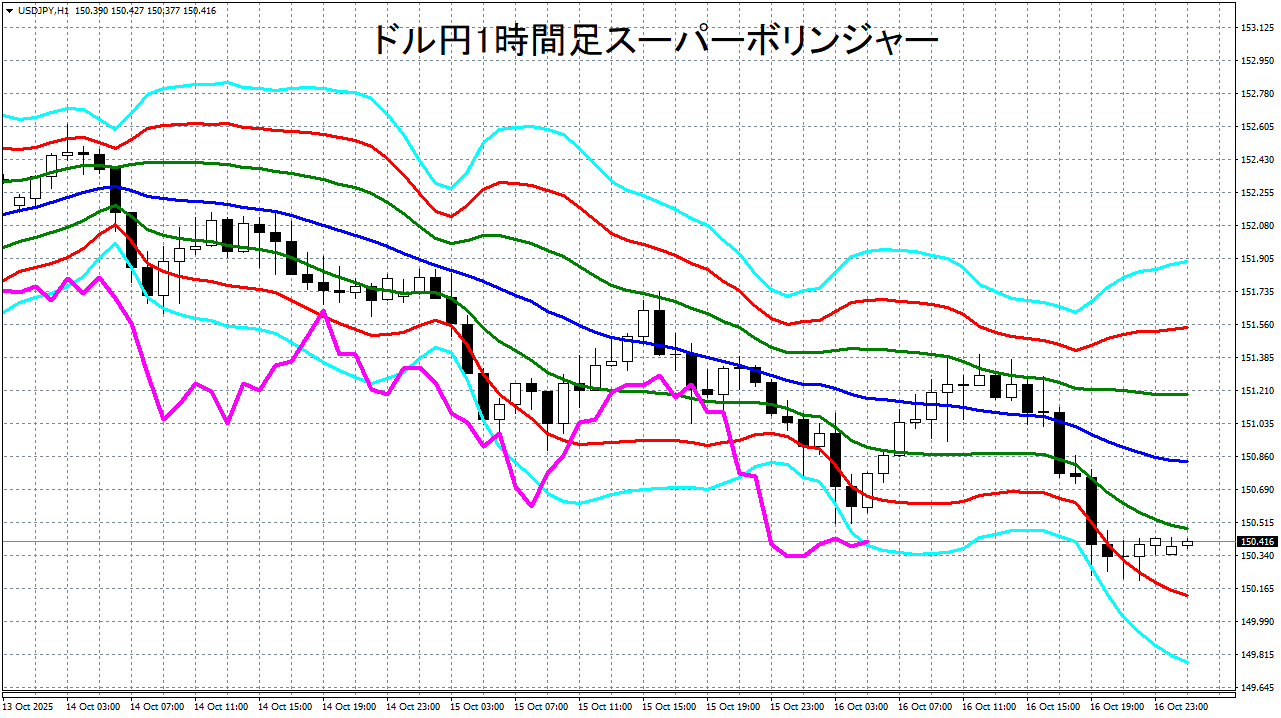 添付チャートは、ドル円の1時間足をスーパーボリンジャーで表示したチャートです。