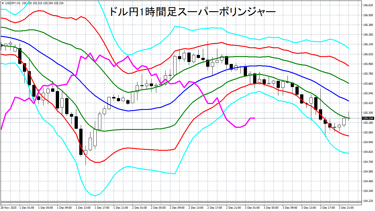 添付チャートは、ドル円の1時間足をスーパーボリンジャーで表示したチャートです。