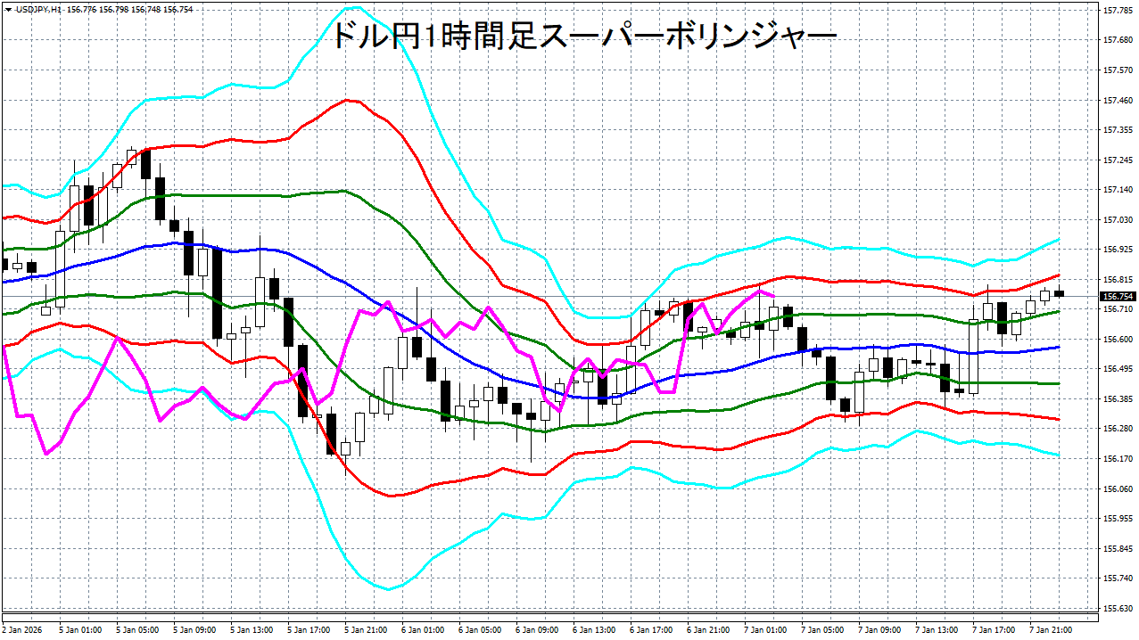 添付チャートは、ドル円の1時間足をスーパーボリンジャーで表示したチャートです。