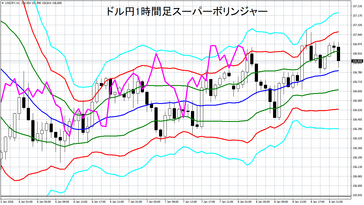 添付チャートは、ドル円の1時間足をスーパーボリンジャーで表示したチャートです。