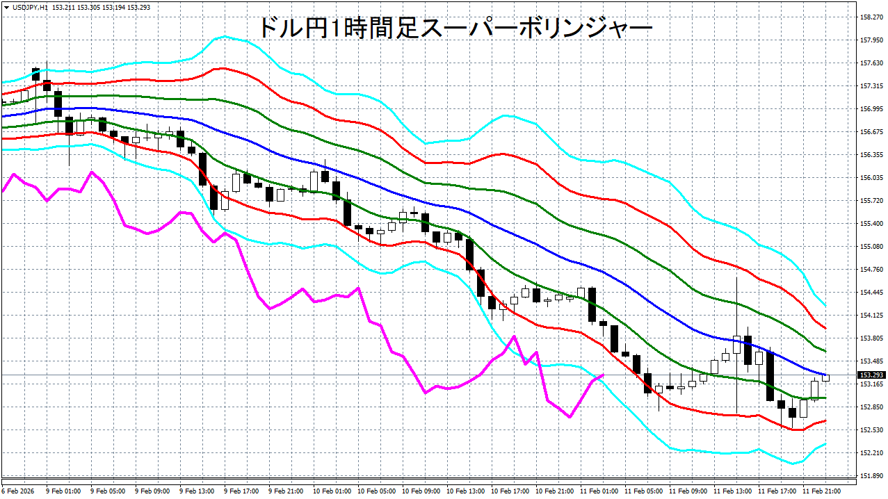 添付チャートは、ドル円の1時間足をスーパーボリンジャーで表示したチャートです。