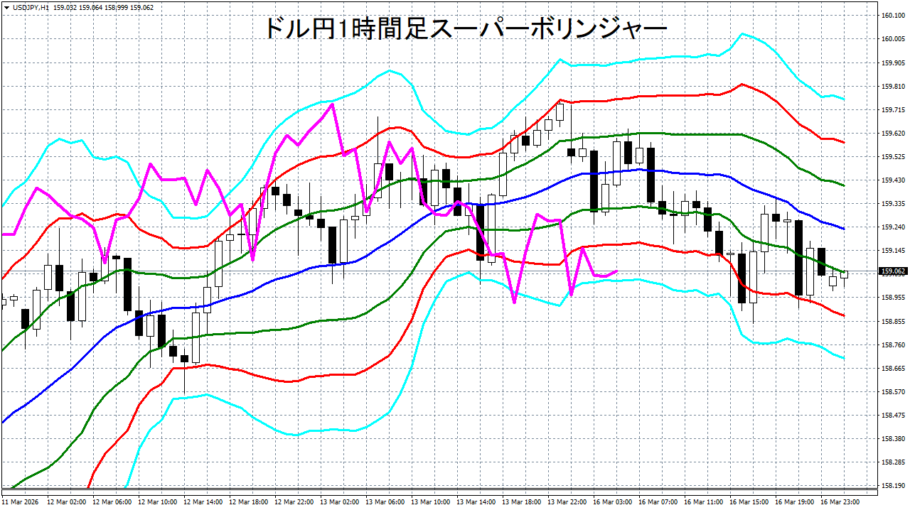 添付チャートは、ドル円の1時間足をスーパーボリンジャーで表示したチャートです。